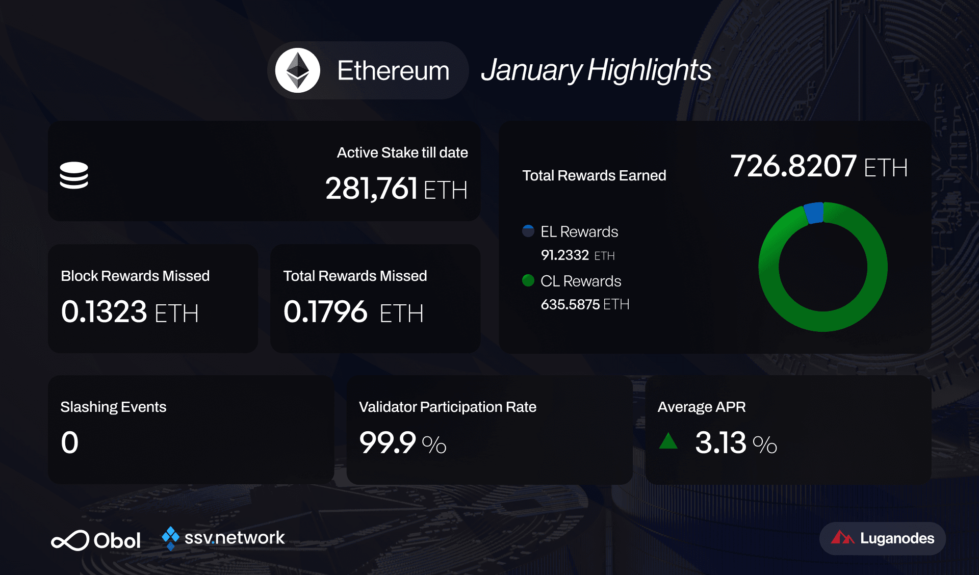 January demonstrated Luganodes’ ability to deliver strong validator performance at scale, with high participation, competitive APR, minimal missed rewards, and zero slashing events.